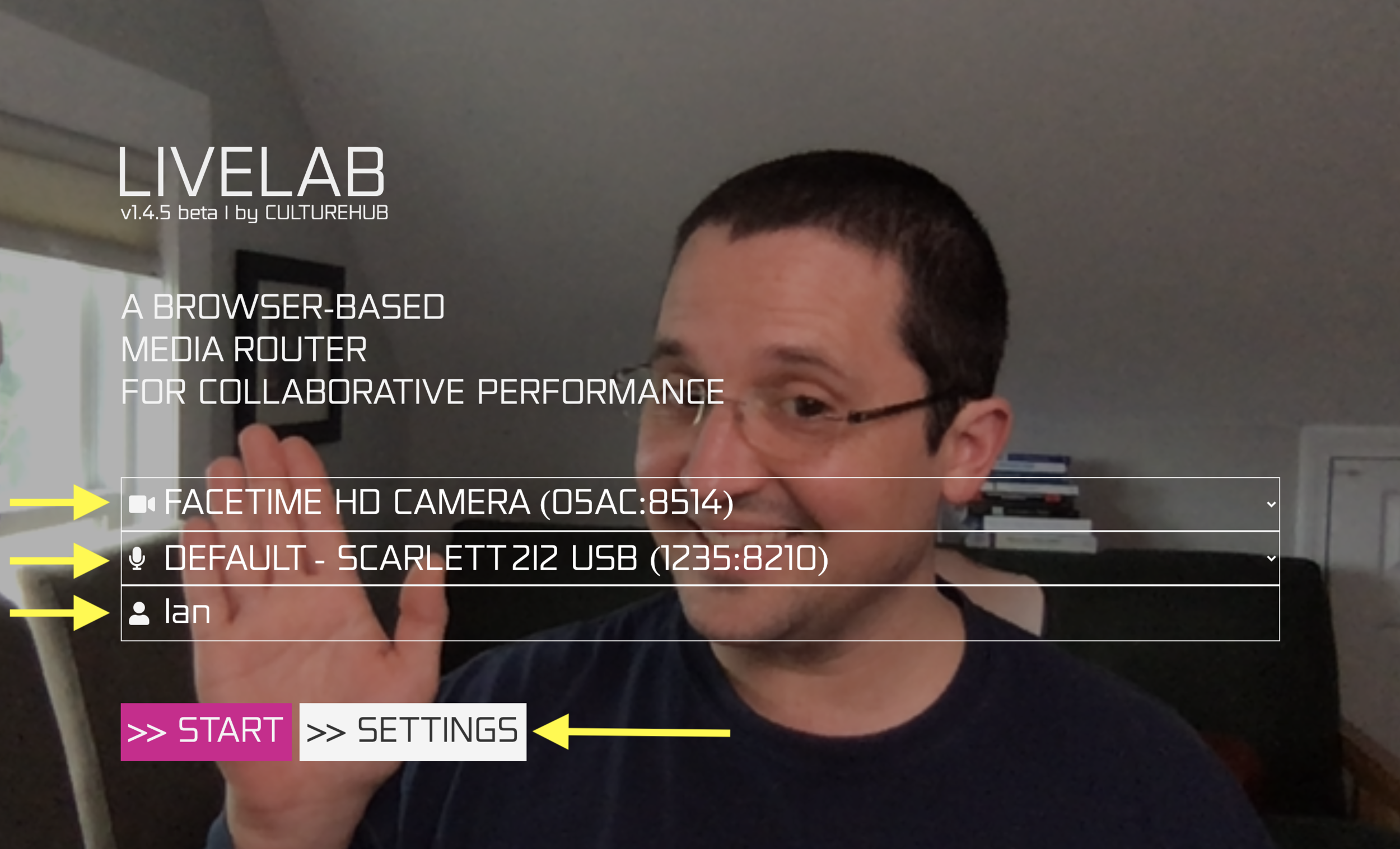 LiveLab is a peer to peer, …”browser-based media-router for collaborative performance…” It is a product of CultureHub, and was originally designed to connect multiple site specific theater spaces. The description may be a little wordy, but stick with me. “Browser-based” means it runs in Chrome. Unfortunately it is not iOS compatible, but will run on the Chrome browser on basically any other computer device (including Chromebooks) at LiveLab.app. There is no app to download. Everything is controlled within a single browser window. “Media-router” means that it takes audio and video streams from one place and sends them somewhere else. This is essentially what Zoom and other video platforms do. They pull in an audio and video stream each from a set of distant participants, send those streams to a server computer, and format those streams to display on your screen. LiveLab differs fundamentally in this last part. It does not aim to push incoming streams into specific places in a Brady Bunch template. It does not limit the number of audio and video streams each participant can send, nor does it force a specific video resolution or audio quality. It does not limit how you choose to view those streams as an end user. It runs in peer to peer mode, saving time by avoiding the trip to a server. And perhaps most importably, it does not require you to keep the streams in LiveLab. It is a perfect tool to bring low latency (not quite real time) video and audio streams into your computer and then send them out via an app like Open Broadcast Software (OBS).
